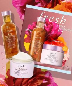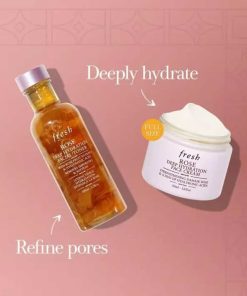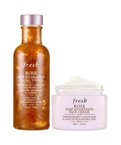 The Fresh Deep Hydration Duo includes two skincare essentials: the Rose Deep Hydration Facial Toner (3.3 oz) and the Rose Deep Hydration Face Cream (1.6 oz). This duo is designed to provide deep hydration, leaving skin feeling refreshed and nourished. The toner removes impurities and prepares the skin, while the face cream locks in moisture, offering long-lasting hydration. Infused with rose extracts, both products are perfect for dry or sensitive skin.