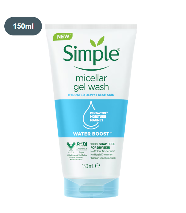 A skin-quenching boost of hydration that lasts long after you wash. Simple Water Boost Micellar Gel Facial Wash, supercharged with a vitamin-rich formula – this is the same gentle care you know and love from Simple – for hydrated, dewy-fresh skin.