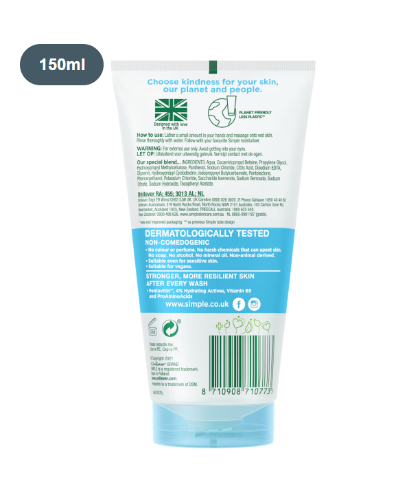 You’ll love this non-stripping, pH-neutral foaming cleanser which leaves skin gratifyingly clean and satisfyingly hydrated. And you can count on this skin cleanser to remove every last trace of make-up, dirt and grime – minus that tight, dry skin feeling. 100% soap free and packed with ultra-hydrating ingredients, this daily cleanser is suitable for all skin types and is super gentle – even on sensitive skin. Like all Simple products, our Micellar Gel Facial Wash is dermatologically tested, hypoallergenic, contains no harsh chemicals and is free from alcohol, mineral oils, artificial colours and perfume