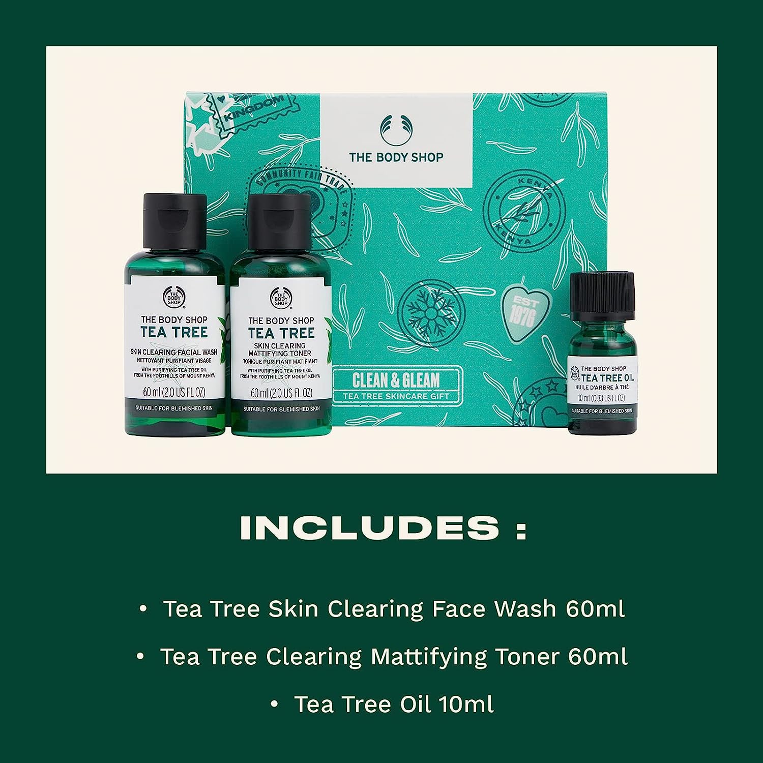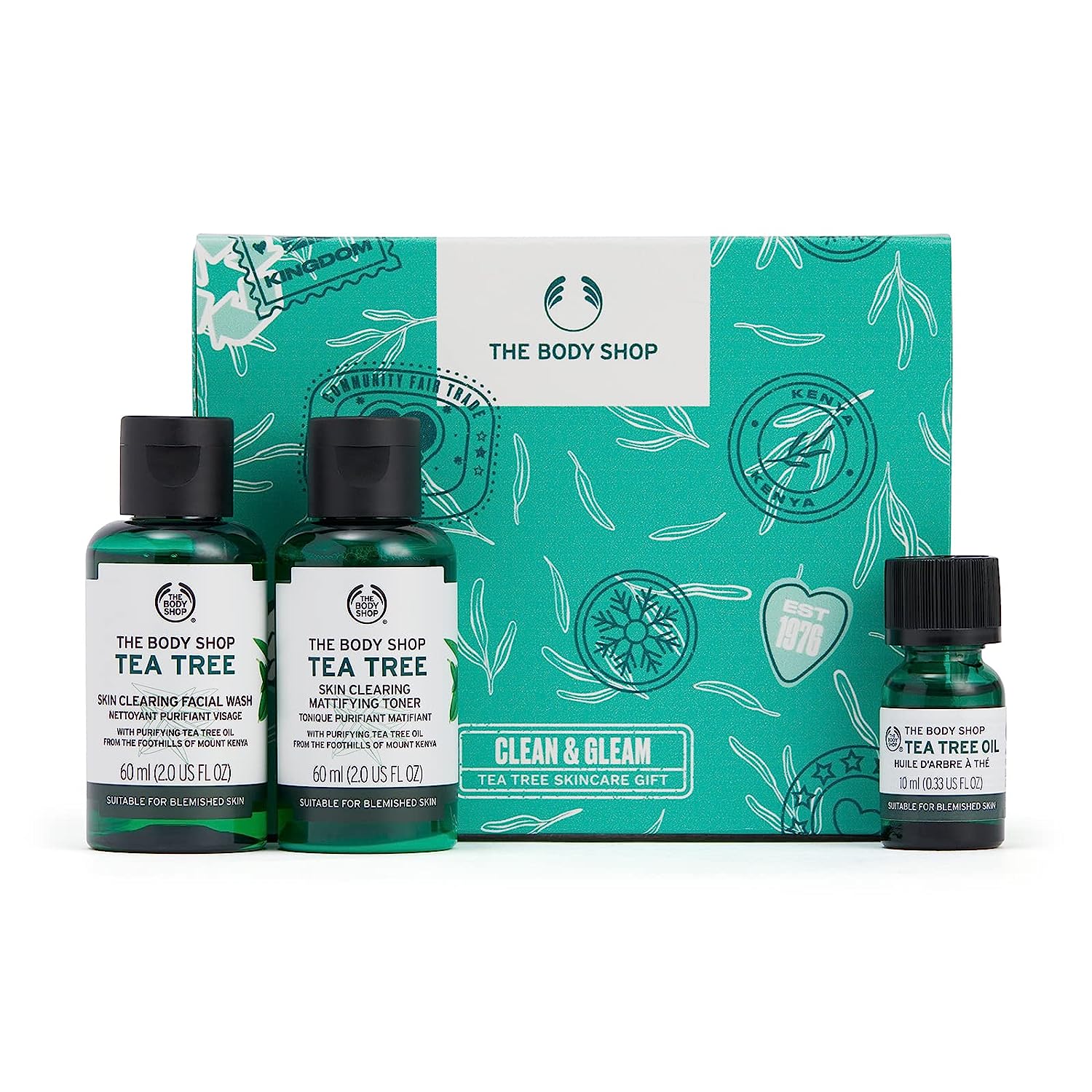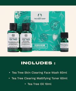- An invigorating stocking stuffer: Includes Tea Tree Skin Clearing Face Wash, Tea Tree Clearing Mattifying Toner & Tea Tree Oil, all made with sustainably sourced, Community Fair Trade tea tree oil from Kenya